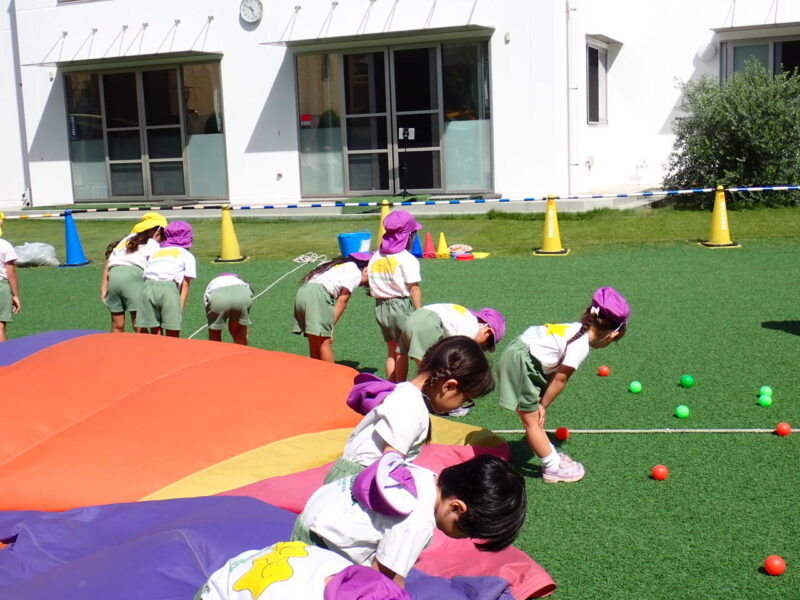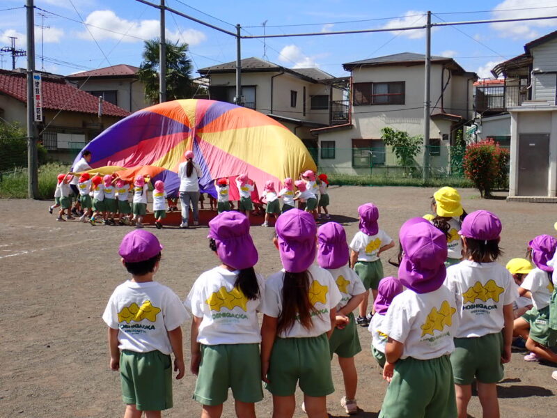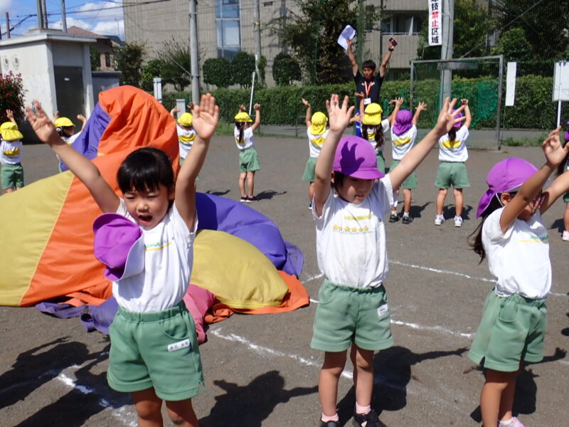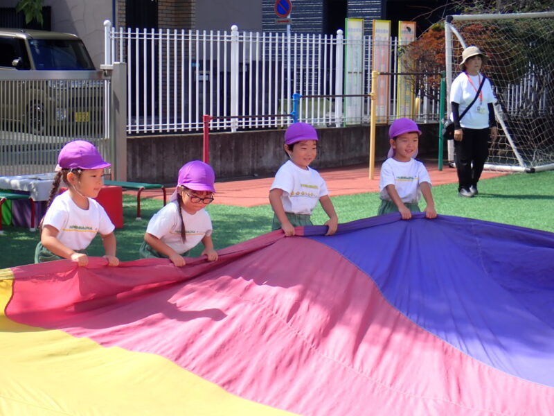 年中さんの行っているパラバルーンを見ていた年少さんが「やってみたい!」と挑戦していました。