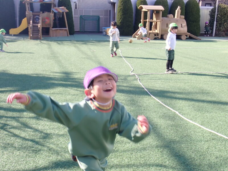 元気いっぱい外で鬼ごっこをして楽しんでいます。 かと思ったらスローモーションになっているお友だちでした☻