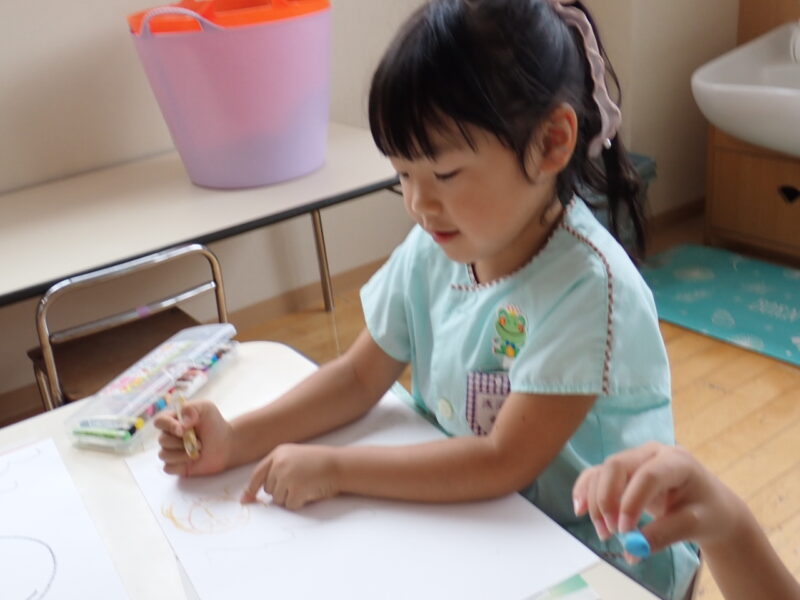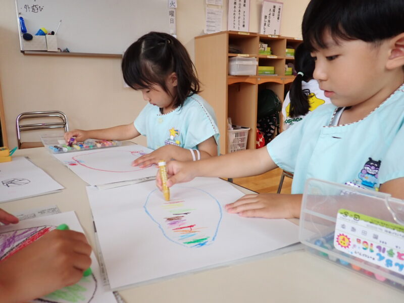 「大玉勝てたのが嬉しかったから、大玉かな」、「パラバルーンの花火すごかったよね」、「徒競走一番になれたよ」と運動会の話をたくさん話しながら、楽しみながら絵を描いていきました。