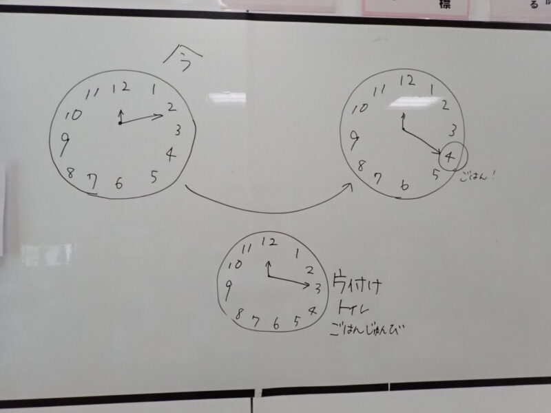 只今、12時10分。「お昼ご飯いつ食べる?」と聞くと、「長い針が4になったら!」とのことだったので、何分に片付けたらいいか一緒に考えました。