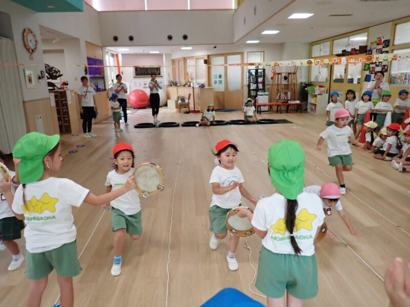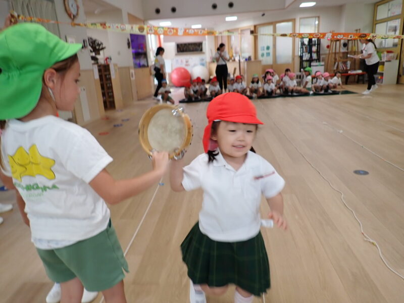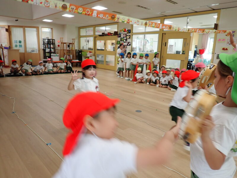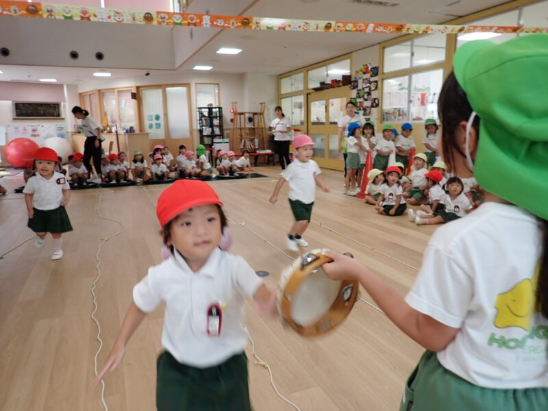 ホールで、年長組さんにお手伝いいただき、取り組みました!