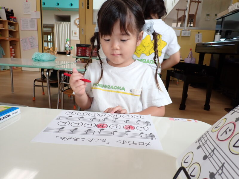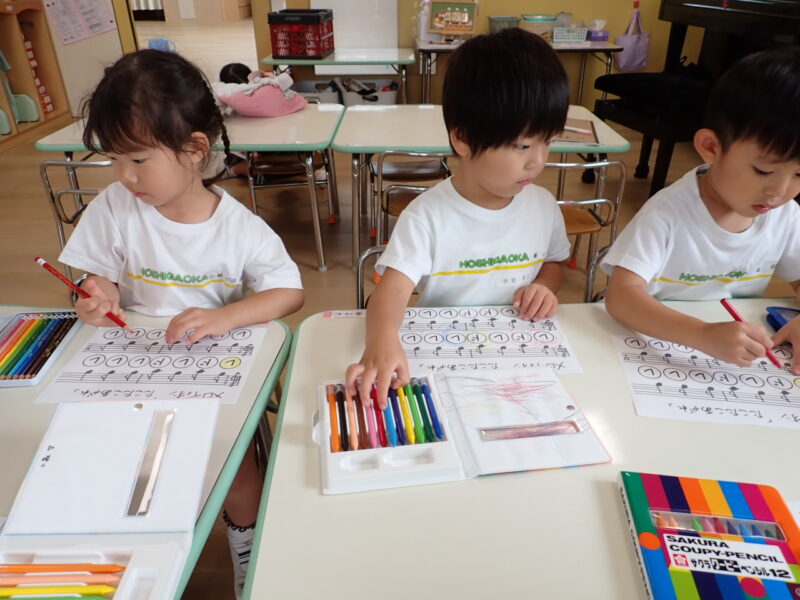 ド→赤 レ→黄色 手本の楽譜を見たり、説明を聞いて色を塗っていました。