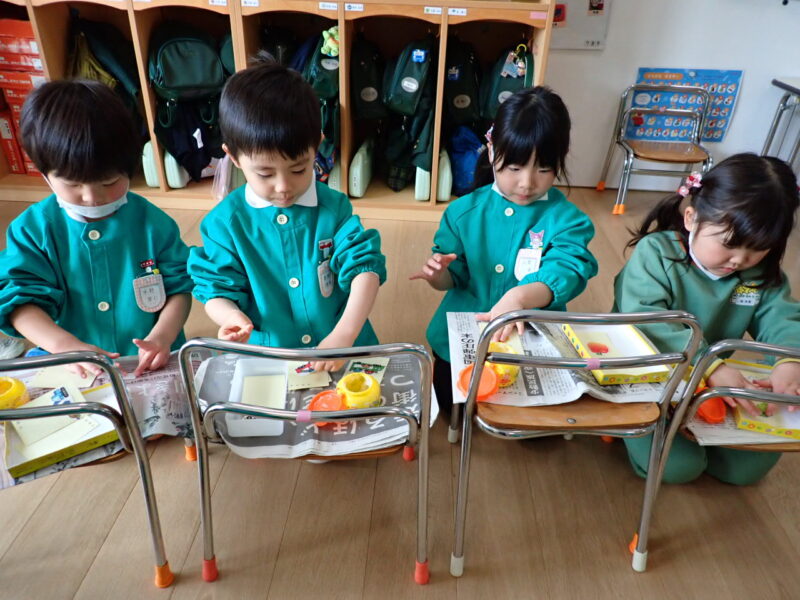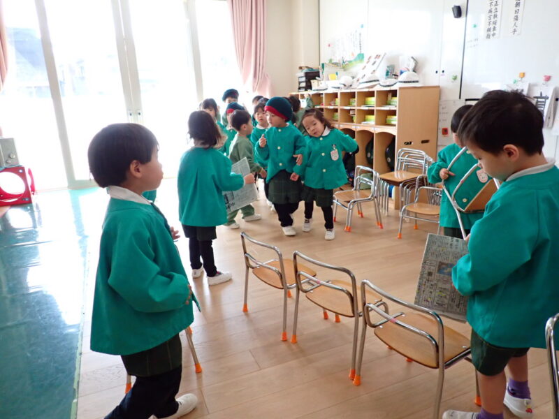 「お椅子机で製作したいな〜」と声をかけると、距離を考えたりして並べている様子が見られました。空間の使い方、間隔の取り方がたくさんの活動を通して上手になってきました!