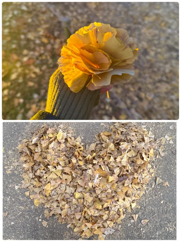 担任は昨日「『昭和記念公園』に行き、銀杏見てきたんだよ〜」「見せて見せて〜」というので、銀杏で作った花束や、ハートを見せると、「作りたい〜✨」と話していたので、たくさん拾って銀杏の花束を作ったよ💐