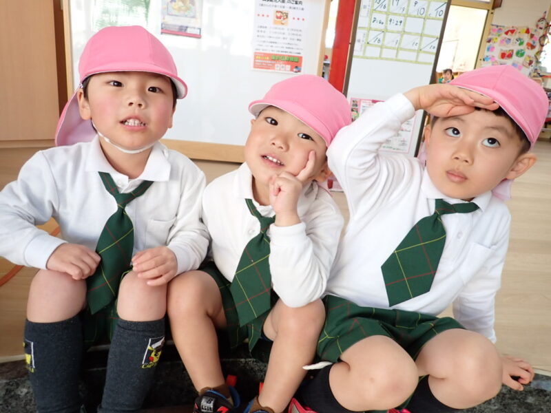 今までは「ネクタイの襟しまってくださーい。」だったのが、「みて〜できたよ!」と話しているお友だちが多くいました。後ろは入っていないにしても、襟の中にしまう意味を少しずつ理解してきた桜組さんです🌸