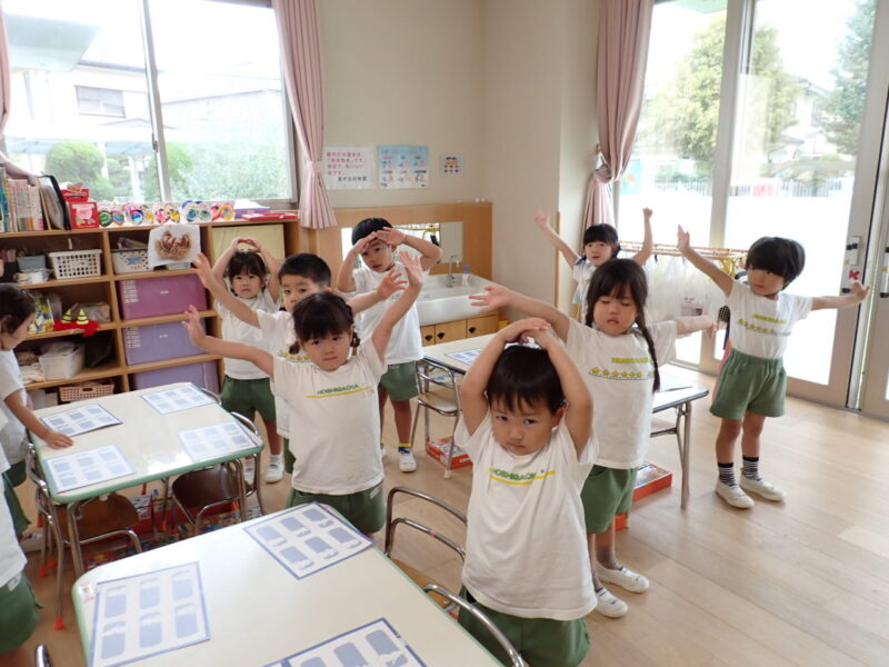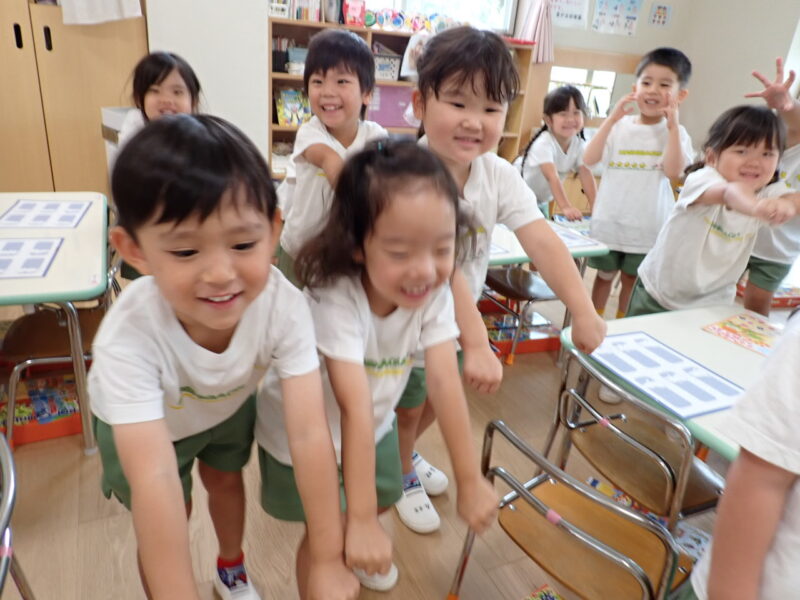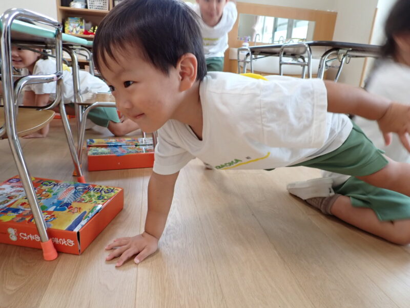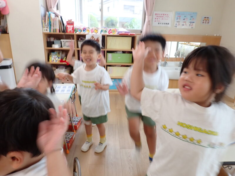 楽しみすぎて、降園時間ギリギリまでお外遊びを楽しみました。「急いで着替えよう!」と着替えと帰りの支度を高速で行いました。すると、なんと早すぎて、お楽しみまで行うことができました🎶お友だちリクエストの『きょうりゅうかくれんぼ』