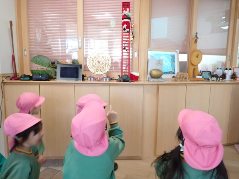 体育あそびから帰ってくると、サンタさんが階段を上り下り、、