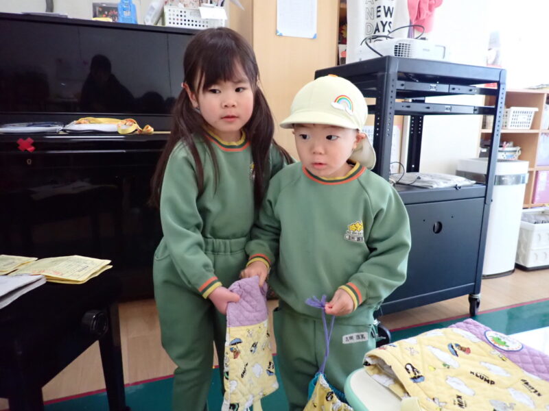 「こっちに入れるんだよ〜!」と声をかけて、一緒にお支度をしていました。今まで年長さんや年中さんにやっていただいていたことを小さなお友だちに行っている姿に成長を感じますね✨