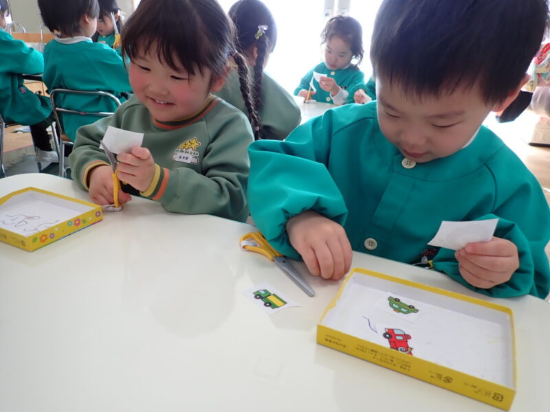 好きな絵を3〜4枚。果物や猫ちゃんたちを切らないように周りの白いところを切りました✂️本当にハサミの使い方が上手になり、細かいところまで上手に切っていました。