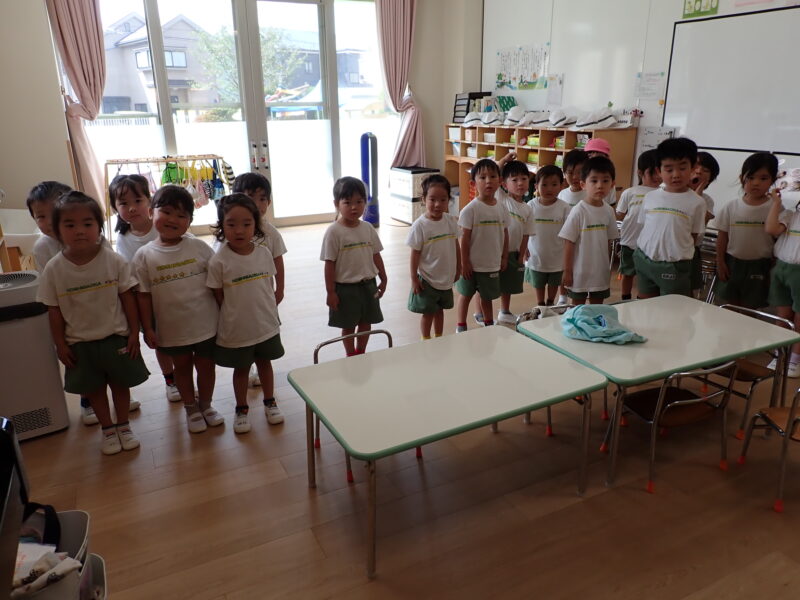好きなところにいたはずが、発声練習が始まると、お友だちみんながこちらを向いていました。どこで誰がお話をしているのか意識しながらこれからも一緒に過ごしていきましょうね!
