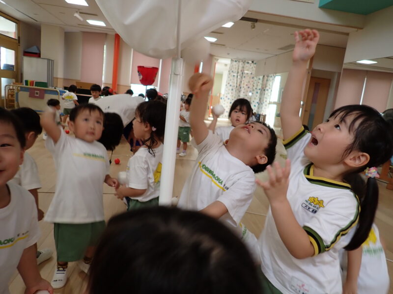 外遊びから戻ってくると、年中組さんがパラバルーンを行っていました。