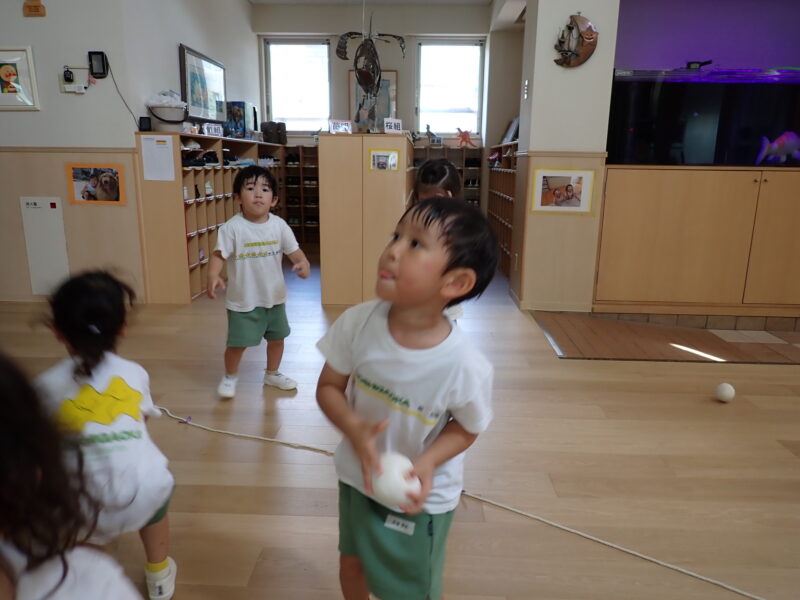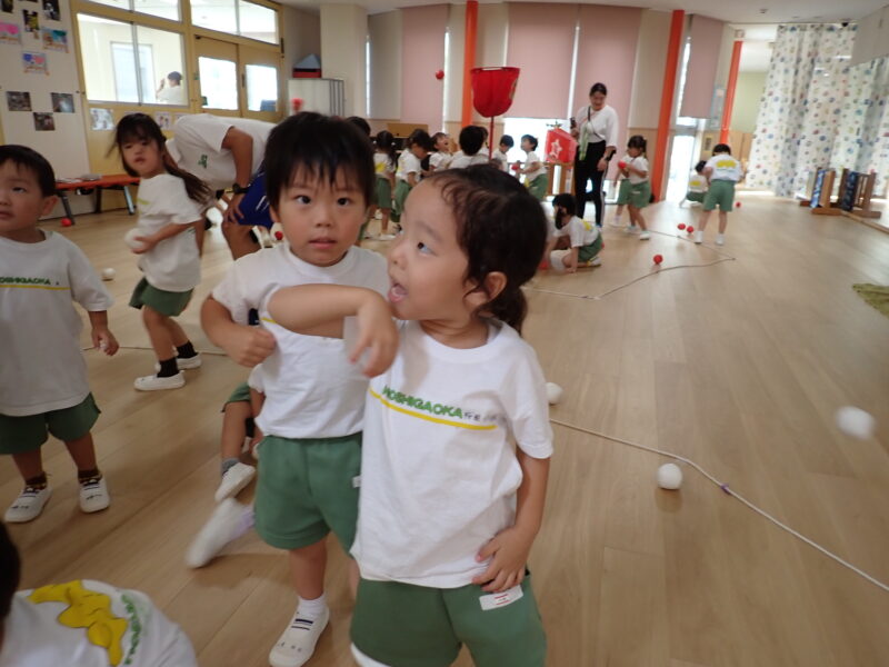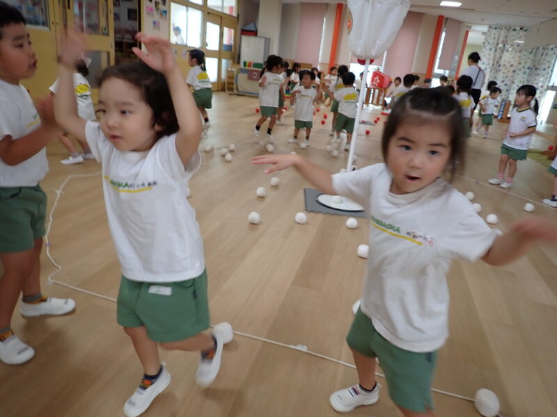 玉入れ勝つために、オリジナルの、自分だけの玉を作ったよ!教室の中でカゴを見つけては『エイッ』とカゴをめがけて入れます。