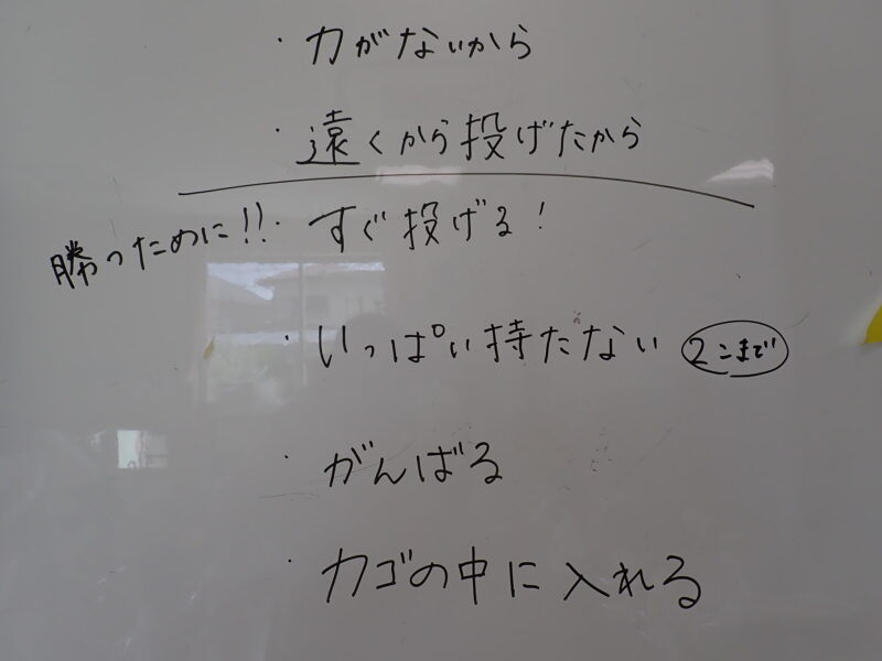 ホールでどのように投げたらいいか、竜﨑先生と話をし、教室でもお友だちと作戦会議!
