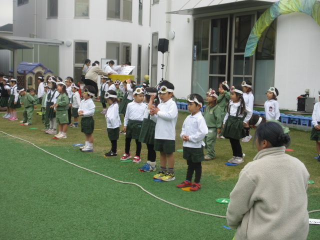 製作で作成したトンボのメガネを着用いたしますので、女児の髪型について、上に結ぶとメガネができなくなります。ご注意ください。