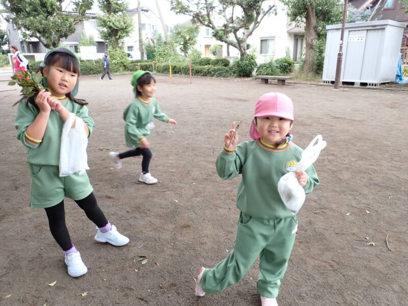 一緒に歩いたお姉さんと一緒に木や葉っぱ、木の実を集めたよ〜😊