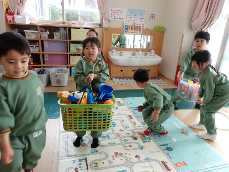 以前はおもちゃを片付けている時に『大きな箱を持ちたい!!』『私が片付ける!』の気持ちがたくさん見られ、まだ片付いていないのに持っていってしまうなんてことがたくさんありましたが、、最近では「まだおもちゃありますかー?」と最後まで片付けられるようになりました✨