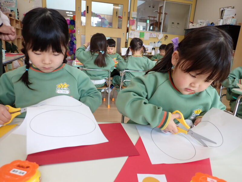 チョキチョキ✂️、折ったり、貼ったりして作成。丸を切るのがとても上手になりました。だいだいは葉っぱを切らないように真剣にチョキチョキ✂️