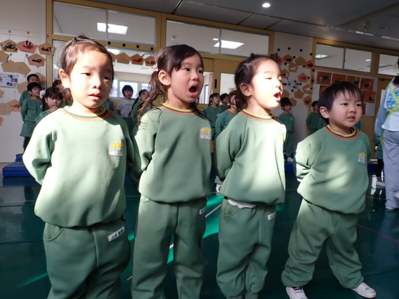 先生は「一生懸命頑張っている、みかん組さん菫組さん虎組さんにご迷惑をかけてしまうなら、フィナーレは出られないかもしれないな。」とお話をしました。「今度からちゃんとやる」と言っているお友だちもたくさんいる中で、「ちゃんとやるってどういうことだろうね?」と投げかけると、「挨拶をちゃんとする。みかん組さんが呼ばれたらすぐに前に行く。」と具体的にお話をしてくれました。