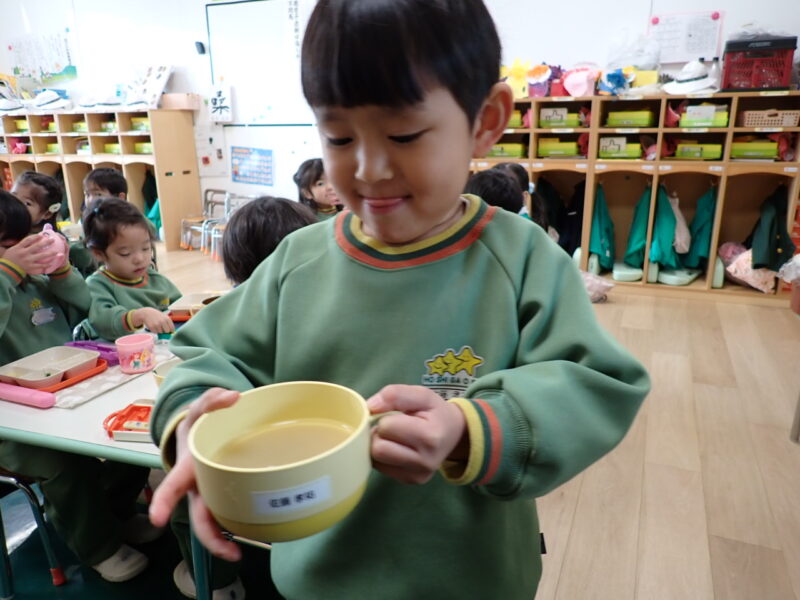 なみなみ注いだスープ。「そーっと運ぶんだ!」とそーっとそーっと運んでいました。