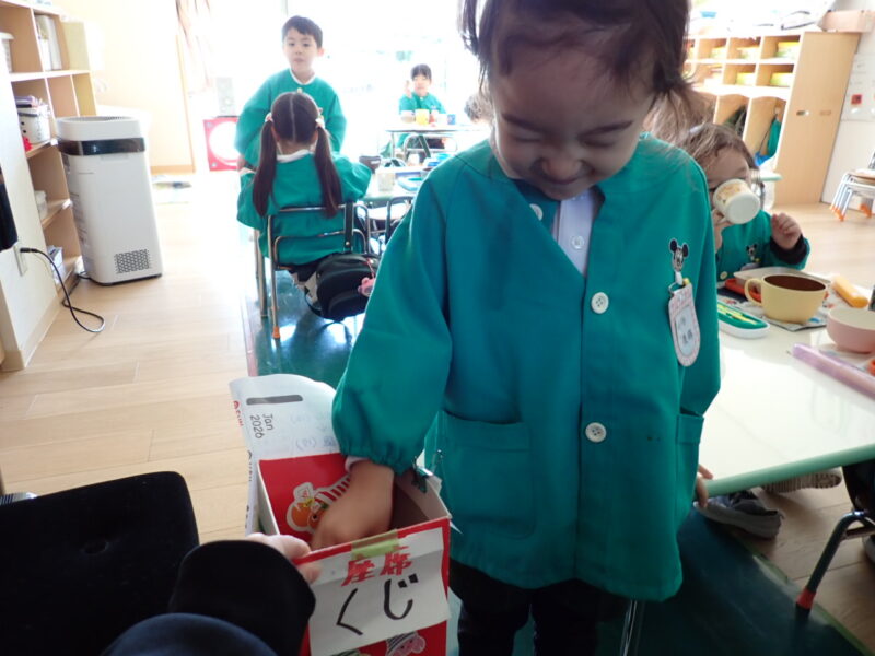 昼食食べ終わったお友だちから発表会の席順を決めるくじを引きました!