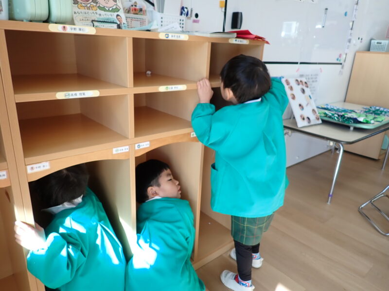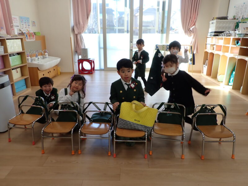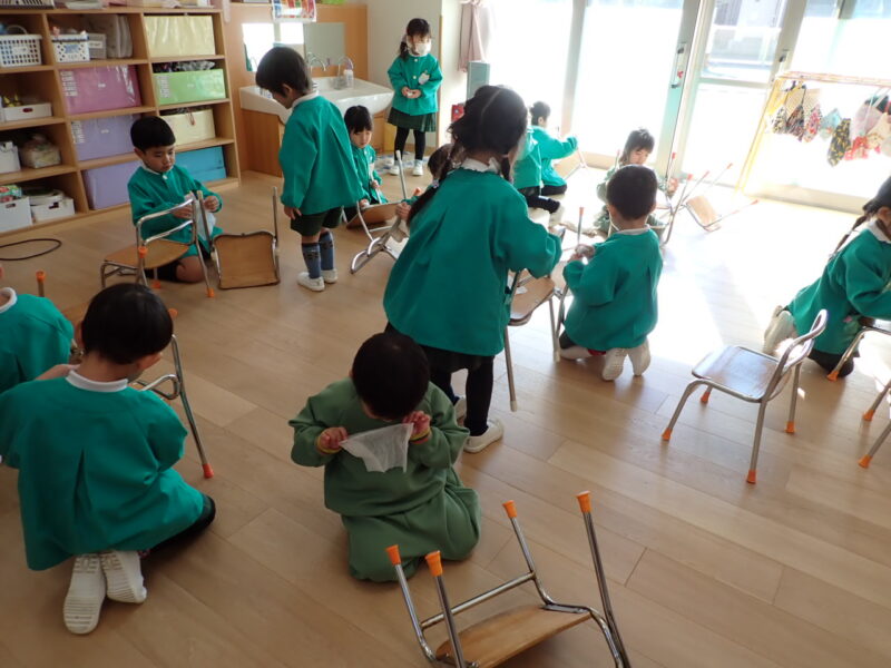 いつもは机を出して、机とお椅子でお支度をしていますが、本日は、椅子で行いました。以前、椅子でお支度をしていたところ、『椅子が出しっぱなしで危ない!』と感じたお友だちがいたため、お友だちみんなに話し、使ったらしまうことを徹底して行いました。