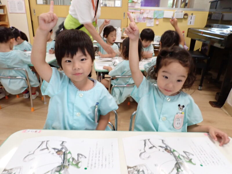 いつも行っているフラッシュカードはクイズ形式にして、お友だちが答えました。
