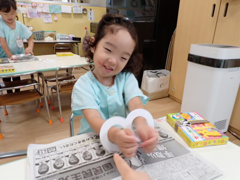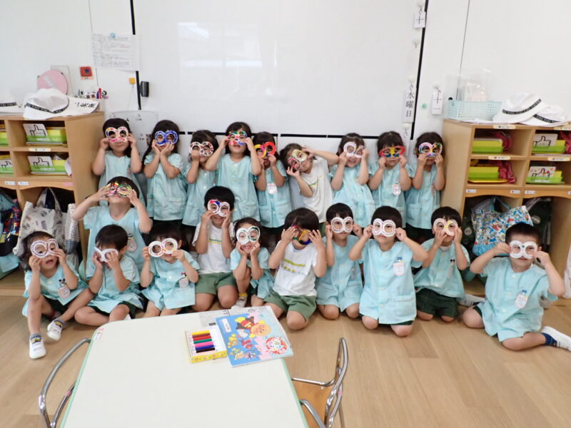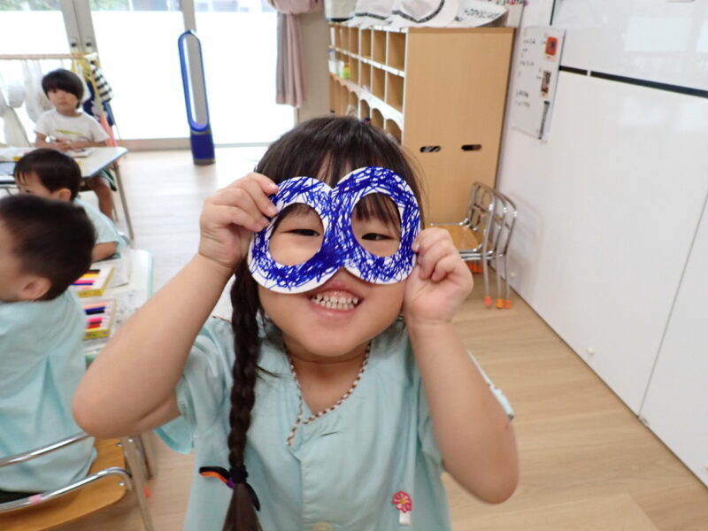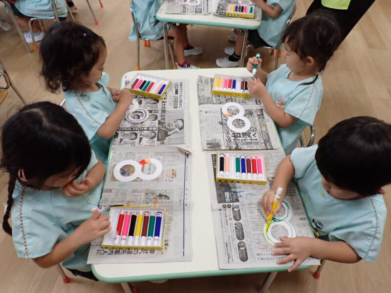 「新聞紙とマーカーを用意して今日は『トンボのメガネ』を作ろう〜!」とお話をすると、大歓喜😁「やった〜!」「レインボーにしよーう!」「赤色?青色?」ととっても嬉しそうにしていました。