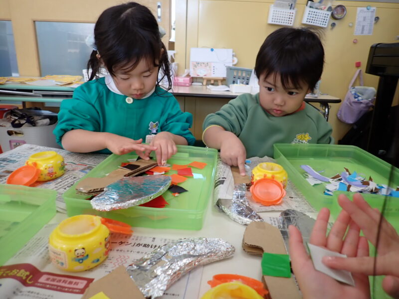発表会の斧や剣を作りました。色は3色選び、切ったり、ちぎったりして、オリジナリティーがとても見られた作品が完成しました✨発表会への第1歩ですね。