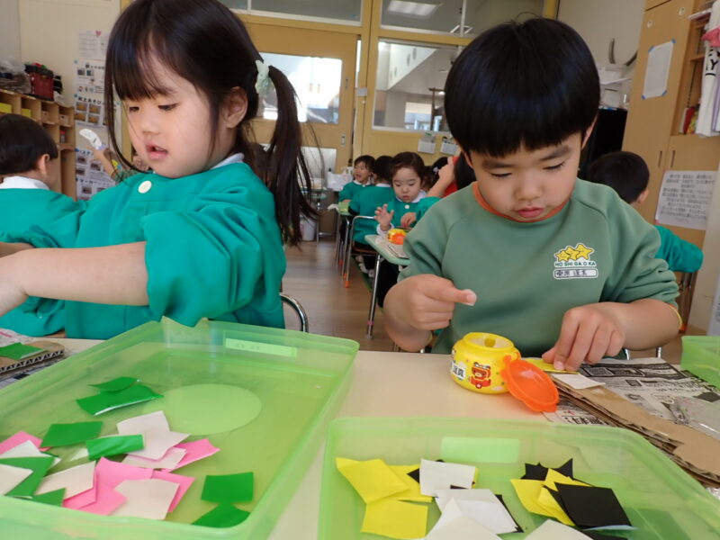 ここからみんなが作った作品が取り組みの間で壊れないように、テープを貼っていきます。完成をお楽しみに〜🎵