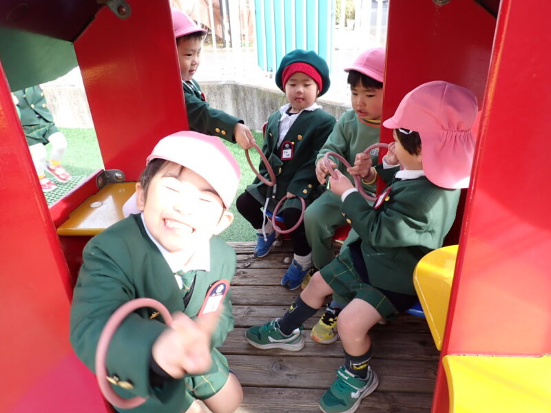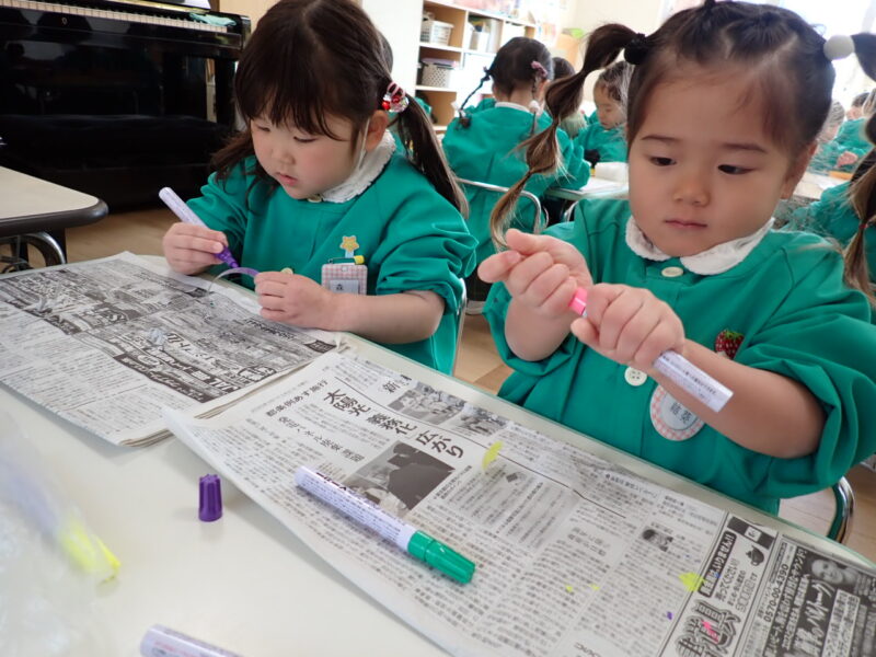 ペットボトルや、紙、ダンボール、みんなのおもちゃ等様々な意見が出ました。「段ボールチョキチョキしたらいいんじゃない?」とのことで、チョキチョキしました✂️