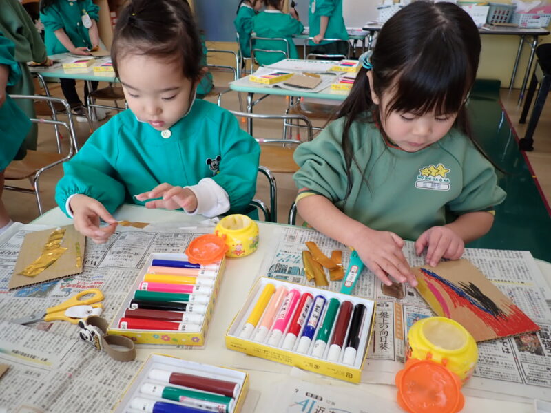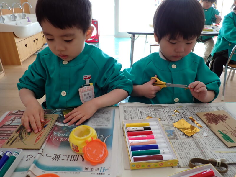 「切ってどうする?」と聞くと、「絵描いたらいい!」とのことで、絵を描き金色の折り紙を切ったりちぎったりして、貼り付けました。