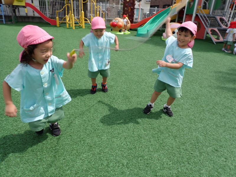 縄跳びを持った2人のお友だちがダッシュをしてそれを追いかけて跳ぶという。。