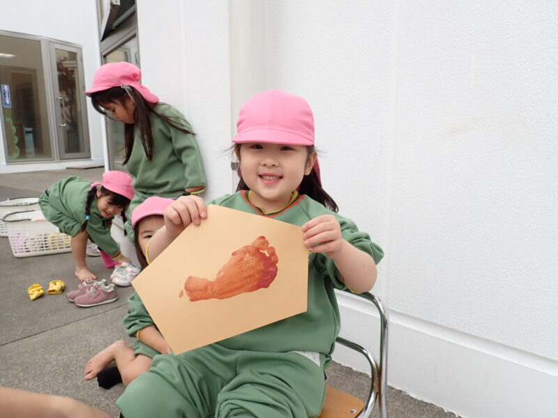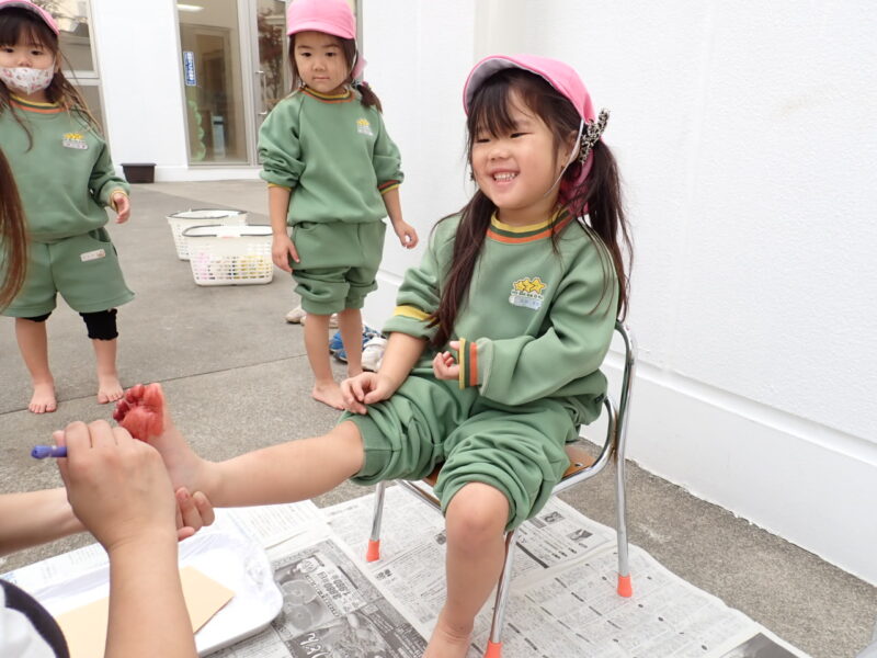 筆で足に絵の具を塗り、「くすぐったーい!」楽しそうなおともだち(*^^*)