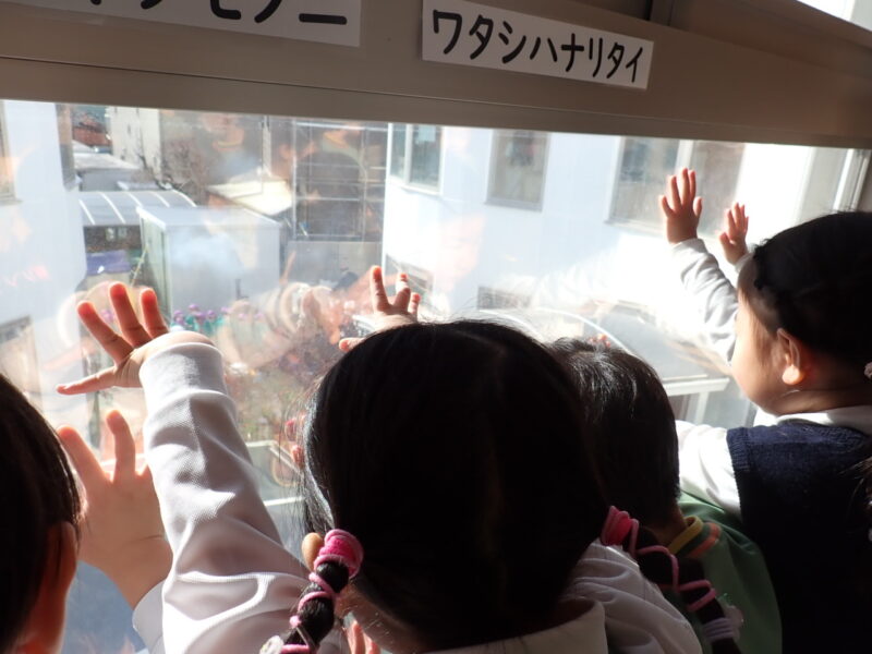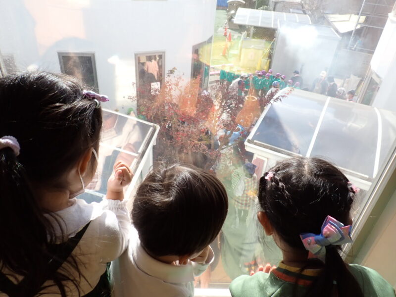 朝の会をした後、2階に行ってどんな風にお餅つきをやっているか2階の窓から見学👀