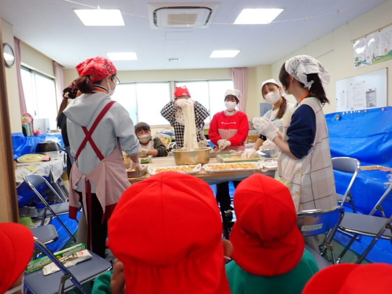 お家に帰ってから「お餅、〇個食べたよ~」というお話が聞かれていると思います。年少組さんが食すお餅のサイズは、大人の親指ほどのサイズです👍初めて食べたお友だち、食べられないかもと言っていたお友だちも1つは食べてみました!多くのお友だちは、10個ほどお腹の中に入りましたよ!自分たちでついたお餅は、格別だったようですね(*⌒▽⌒*)