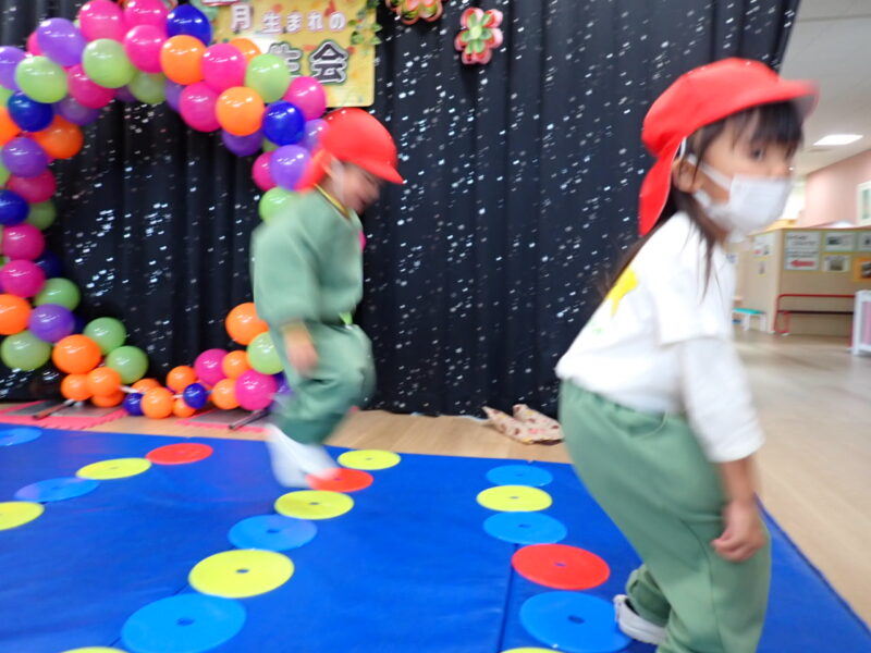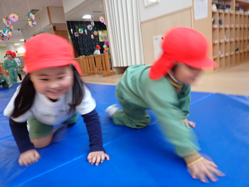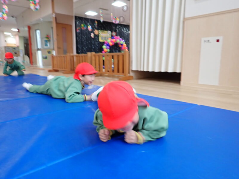 縄をグージャンプで飛び超え、グージャンプで進んで、最後は、赤ちゃんやワニさん、キリンさんで進んで行きました。