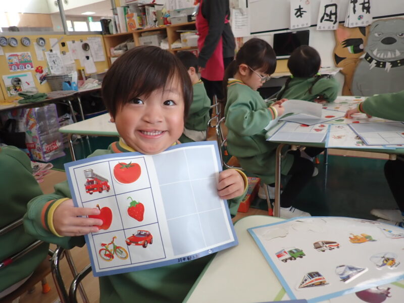 「食べ物シールと乗り物シール」を見ながら