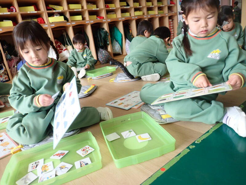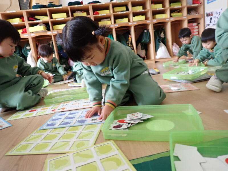 お友だちとジャンケンして、順番に好きなカードをとっていくルールを決めてあそぶお友だち、一つのシートに色々な種類のカードをはめて「好きな物」を集めているお友だちもいました!