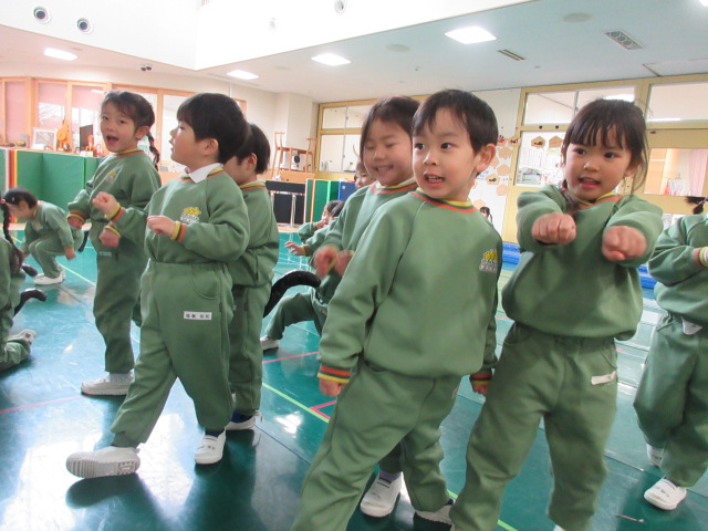 今日は、朝、園庭あそびへ。おひさまがかくれんぼしていて、少々、寒かったのですが、体育着にスモックを着て、過ごしました。
