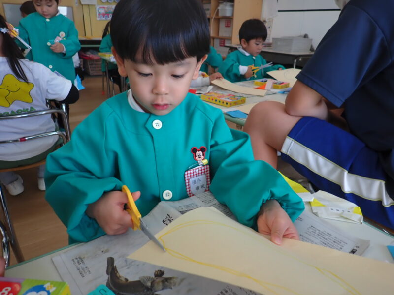 前回の鋏指導は、少人数で対担任と行いましたが、今日は、一斉指導の中で、取り組んでみました。安全に取り組める様、副担鈴木、職場体験の中学生のお兄さん、椎谷先生、川又先生、担任と、各机について行いました。再度、持ち方から確認✂ 慌てず、ゆっくり・・・怪我なく行えました👍