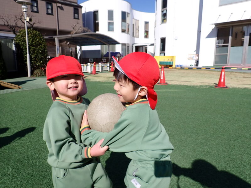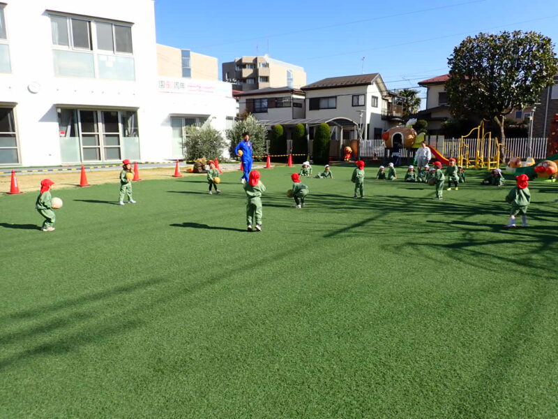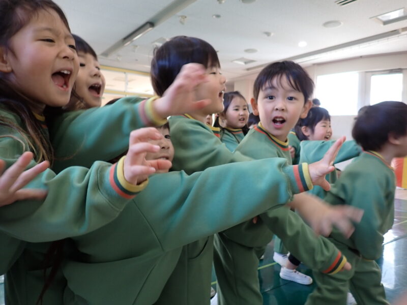 ルールは、「おともだちにぶつからないように広がる」です。今日は、赤帽子(徒歩通園)、白帽子(バス通園)の2グループにわかれての取り組み。両グループ共に、広がるのがとても上手でした👍・・・表現劇でも活かせそうです✨
