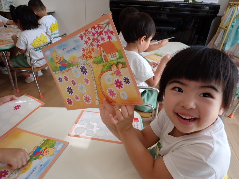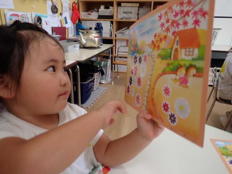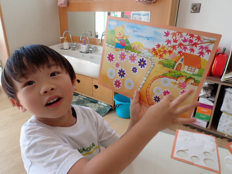 コスモスの花のシールをどうやって貼ろうか自分で考えて貼りました😃