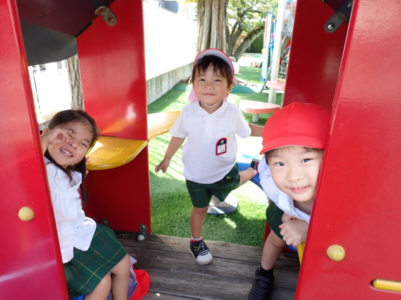 学校の取り組みの後は、制服に着替えて、園庭あそびとホールあそびと、どちらで遊ぶか自分で決めました。