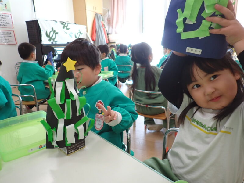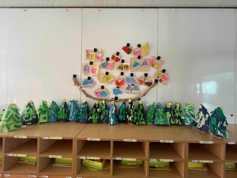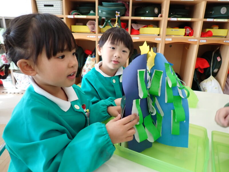 先日、折り紙を細長く切って、それを丸くして貼った物を△に(これは、担任が行いました)。仕上げに☆をつけました