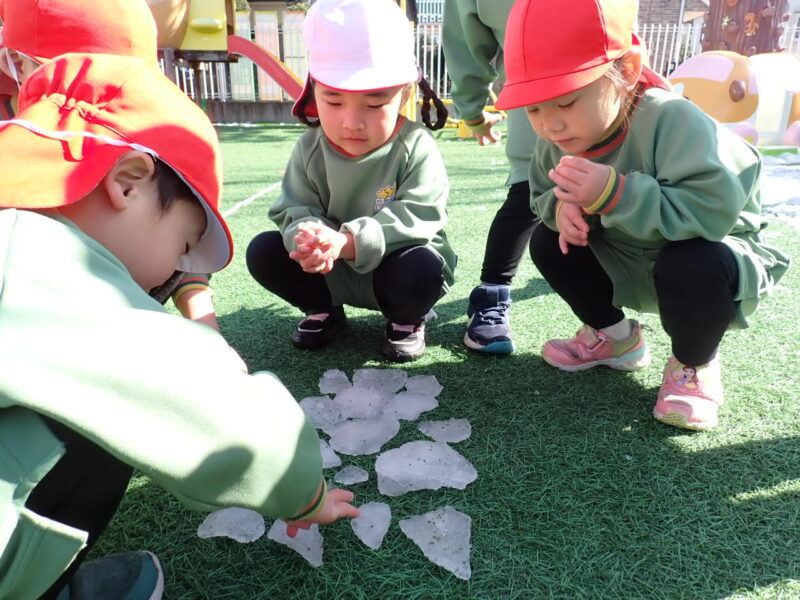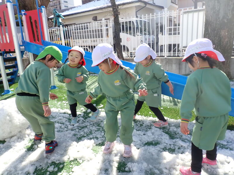 『雪遊び』・・・日曜日に降った雪がまだ少し、園庭に残っていました。